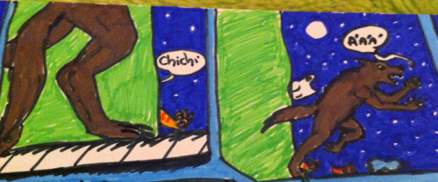 Tak můj 1. Komix je o vlkodlačici, které chce zákeřná kočka ukrást pytel s rybama ( kdo by nevěděl co je to, co táhne za sebou :D )